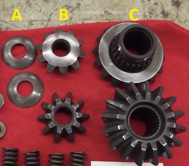 A=pinion gear thrust washers, B=pinion gears, C=axle gears.