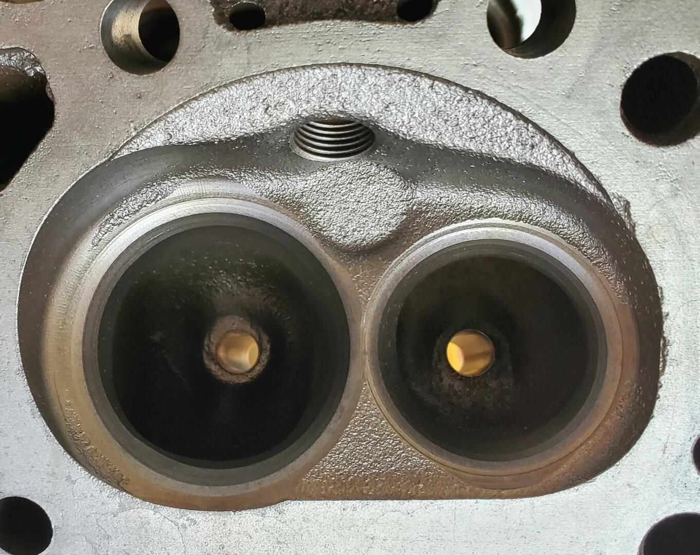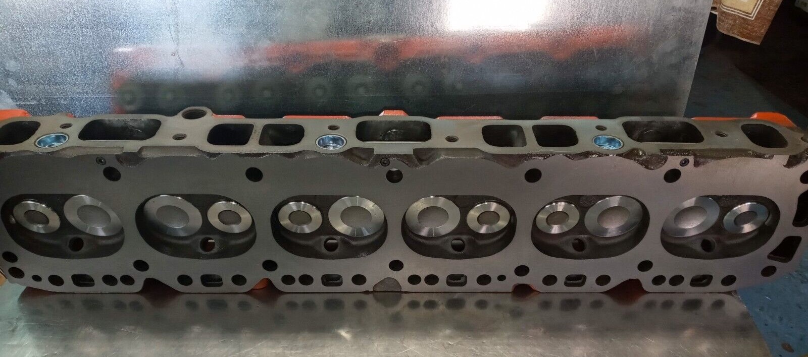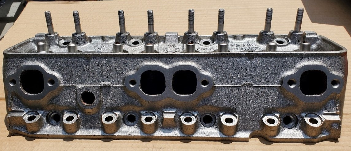 The head design is unlike the small block and big block heads. The intake and exhaust ports are both on the the drivers side of the head whereas the SBC and BBC both have crossflow design heads. Intake valves share the siamesed intake ports of the 1/2, 3/4 and 5/6 cylinders. The spark plugs are on the opposite side of the head. The intake valve size is 1.72 inches and the exhaust valve is 1.50 inches. The heads can be machined to accept larger intake valves to increase performance.