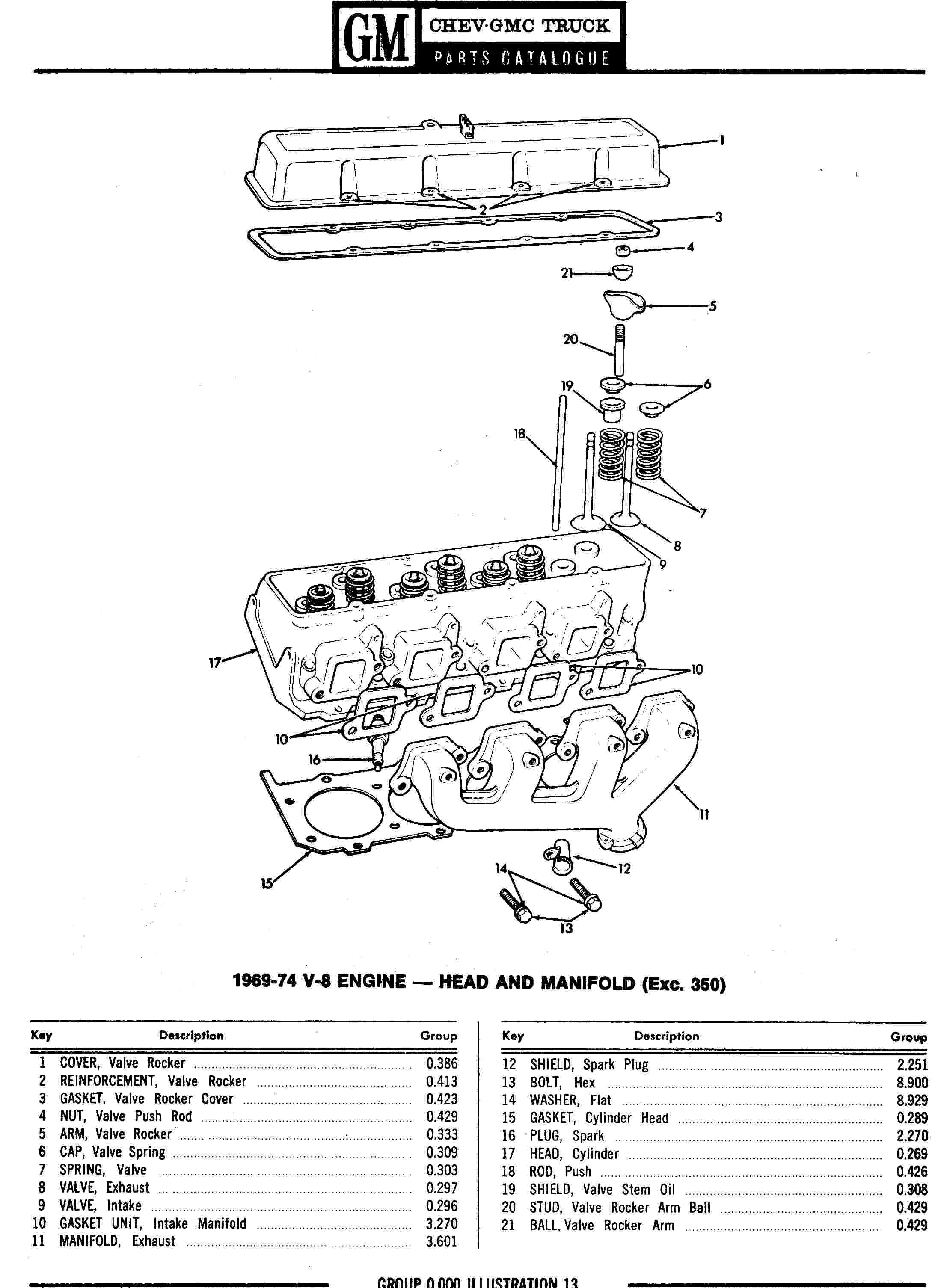 The ZL1 engines in 1969 received heads with casting number 3946074. These used a new open chamber design, with a larger combustion chamber (118 cc) compared to earlier closed chamber heads. They used the same size intake valve (2.19) as rectangle port heads, but used a larger (1.88) size exhaust valve. The "074" heads were also used into the 1970s.