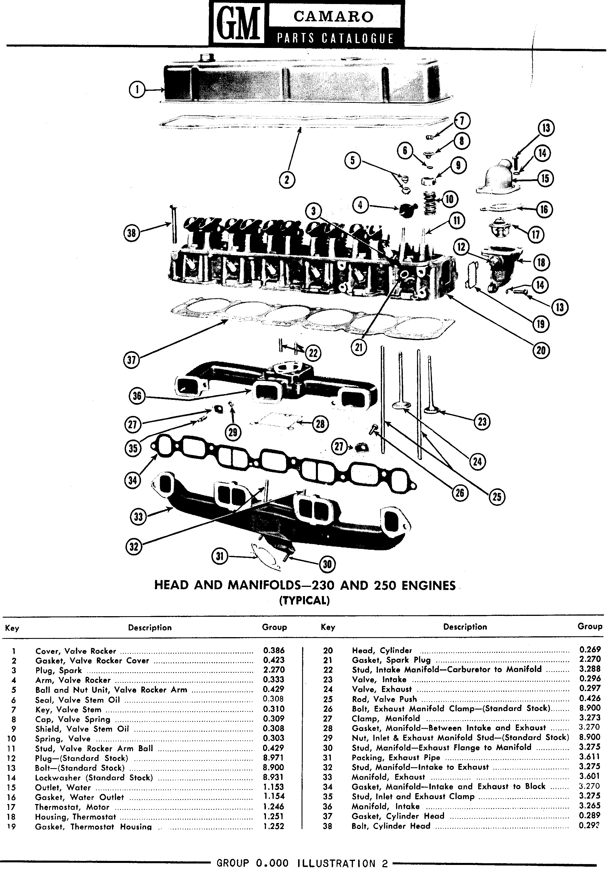 The 230 and 250 cubic inch L6 engines for 1967 to 1969 Camaros used the same basic cylinder head design. So far, only the 3864486 and 3927763 casting numbers have been observed on L6 cars. Three other heads could have possibly been used, but are unverified: 3824437, 3872708, and 3895052. These had a combustion chamber size between 72 cc and 74 cc. The casting number is on the top of the head, under the valve cover. There will be some numbers cast on the passenger side of the head between the spark plugs, but these are not reliable for identification.