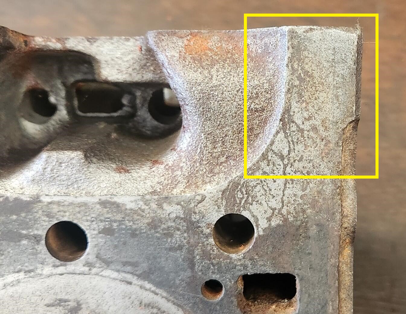 The casting numbers and casting dates are hidden when the valve covers are installed. Most SBC heads will have a casting symbol on the end of the head that can help with identification. Oval port BBC heads do not have an external casting symbol. Rectangle port BBC heads do have a casting symbol on the end of the head (shown below).
