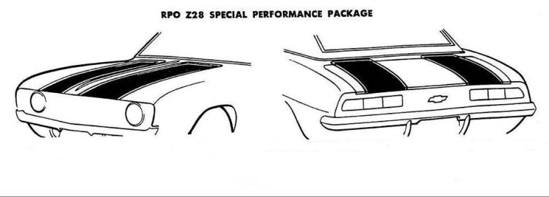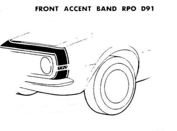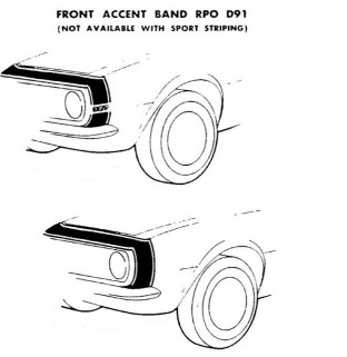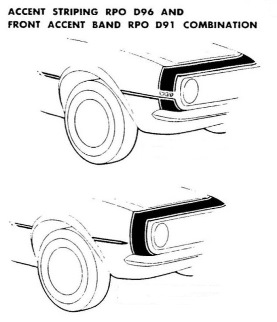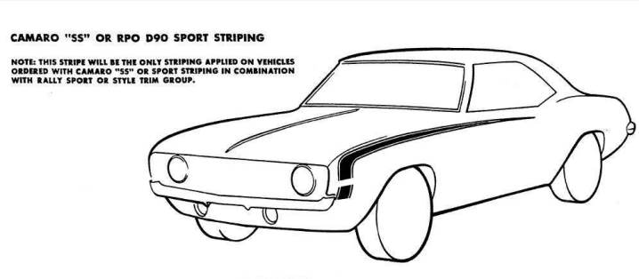 The D96 stripe was modified for 1969. It consisted of two pinstripes - each stripe started along the front edge of the wheel opening and extended rearward over the wheel opening, following the body line. The D96 stripe was included with style trim or rally sport and was also available as a stand-alone option. Though GM documentation states that the D96 stripes were "Not available when Camaro SS, Special Performance Package, or Sport Striping is ordered", the D96 stripes have been observed on some original Z28's and SS cars.