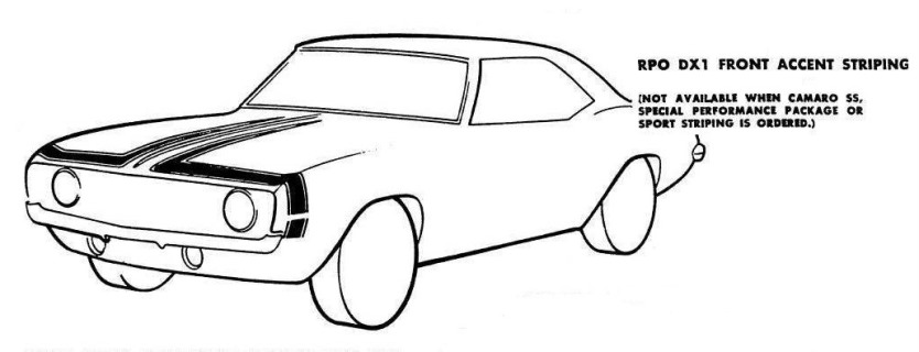 DX1 was a new stripe option which was only available on non-SS, non-Z28 Camaros. The DX1 striping package had a stripe on the header panel and fenders (similar to the D91 stripe) that extended down the center of the hood.