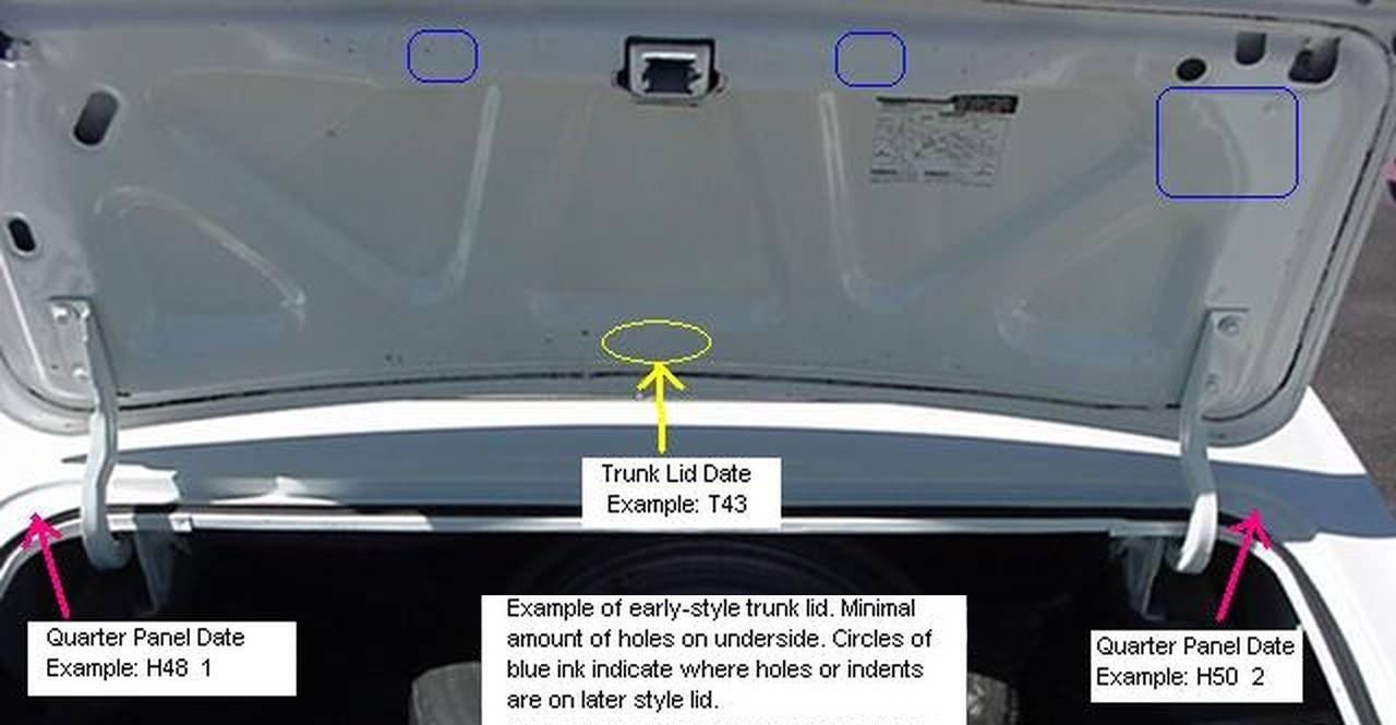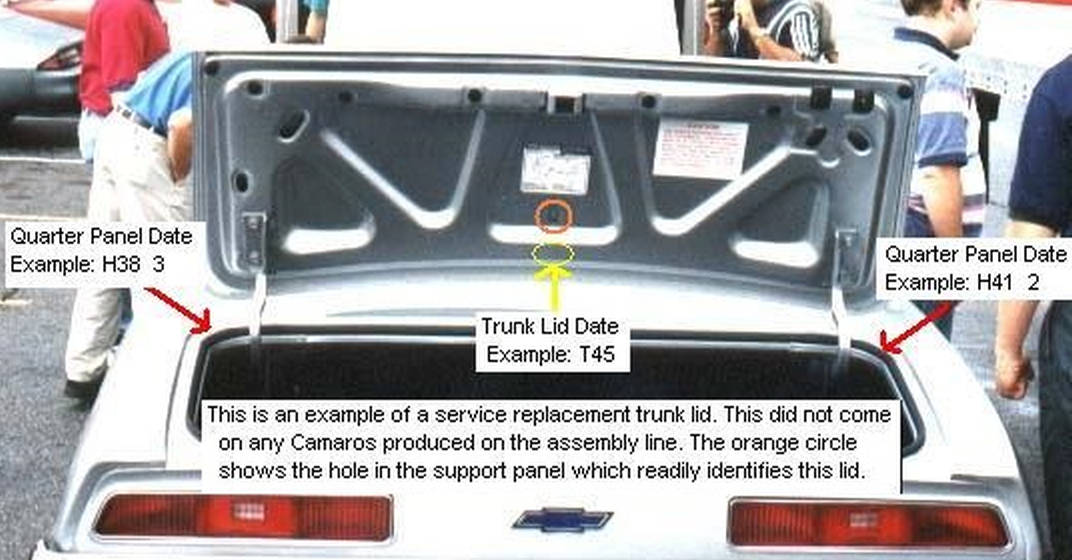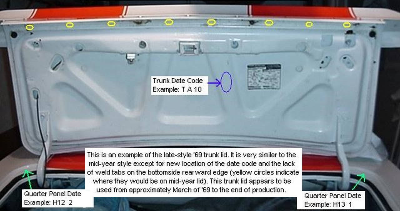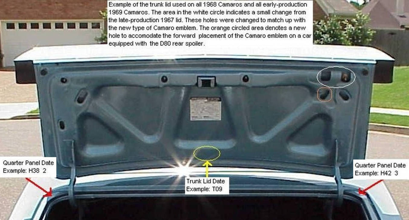 The final version for 69 incorporated minor changes, namely removal of the tabs on the rear edge of the trunk lid and a change in the date code location. Service trunk lids have an extra hole in center of the support panel. That hole only appeared on some early 67 decklids (which will have the early style underside) and service parts (which have the spoiler holes, etc.) - no other production Camaro trunk lids have that hole.