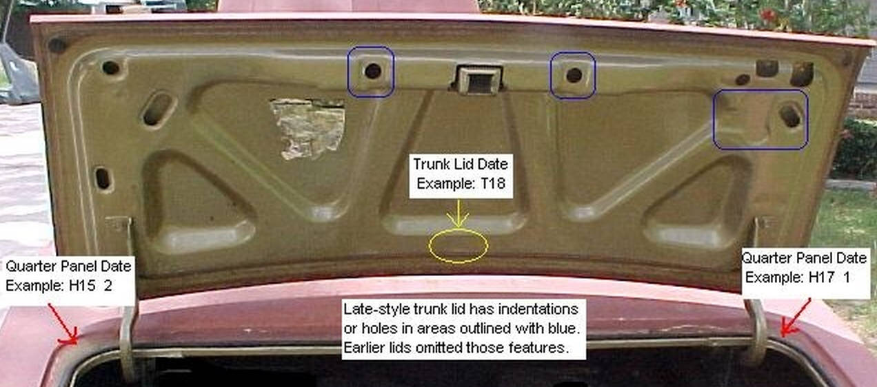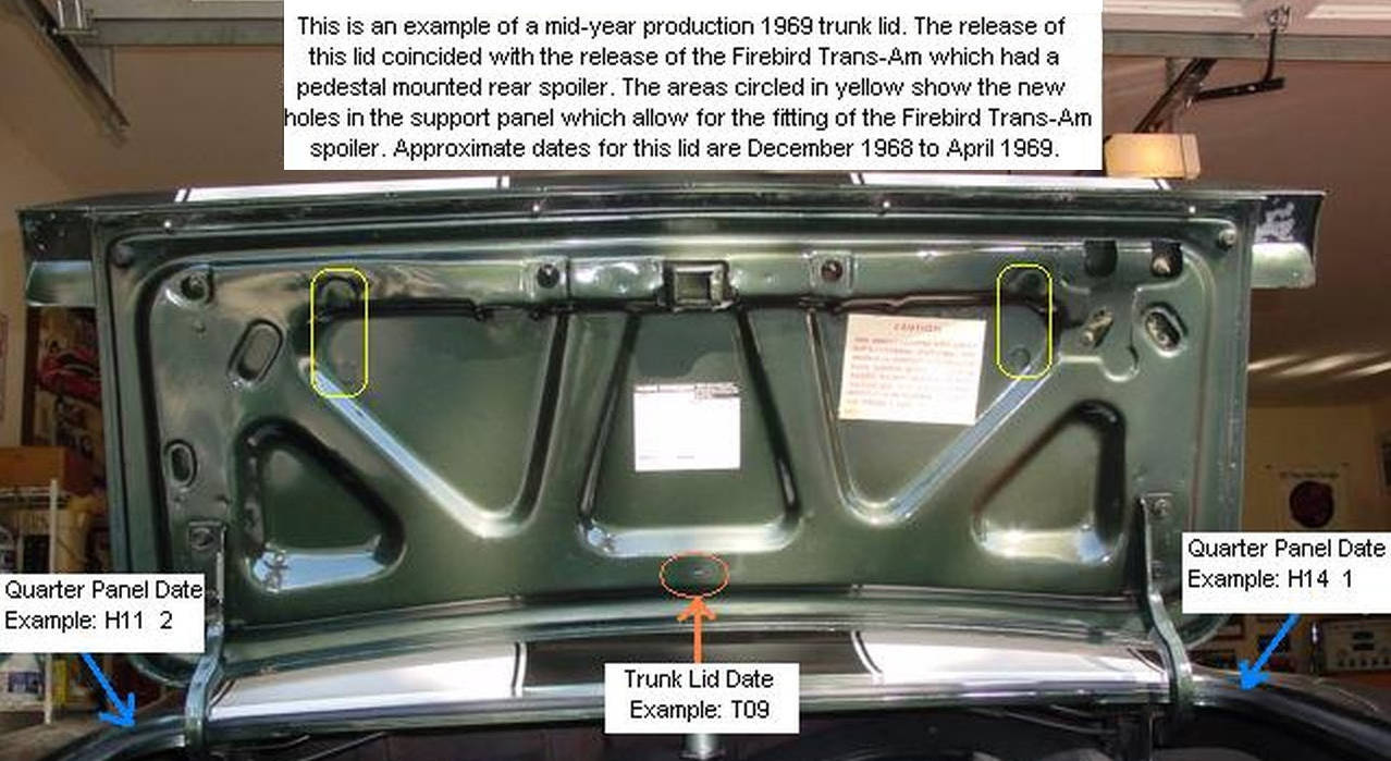 The trunk lid was changed again for 68, namely for the new emblem design and an additional hole for the emblem when equipped with a spoiler. This design was used during the 68 model year and into the 69 model year. The trunk lid was changed again in the December 68 time frame to add holes to enable installation of the Firebird Trans-Am spoiler.