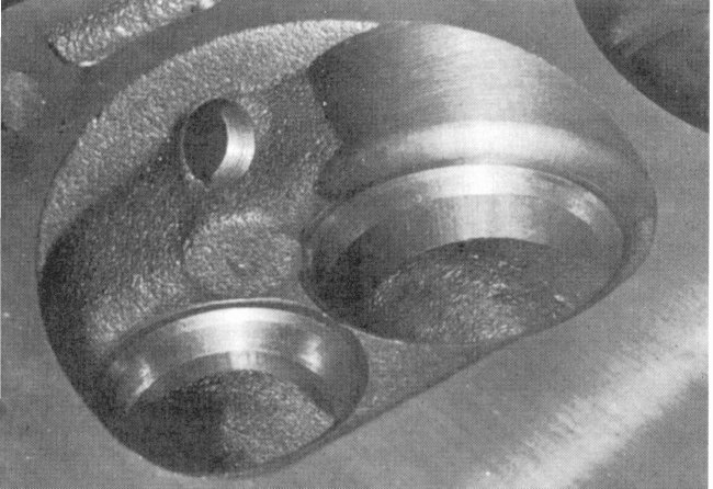 The block line consumed the most space, with the huge deck broaches the size of locomotives feeding long high-speed transfer lines that did the drilling and tapping of bolt holes, the boring and honing of cam, crank, cylinder and lifter bores, and gun-drilling of all the oil galleries. The block was clamped and precisely registered to its machining pallet by pins into two master locating holes in the pan rail surface adjacent to the fuel pump and starter pads on the right side of the block.