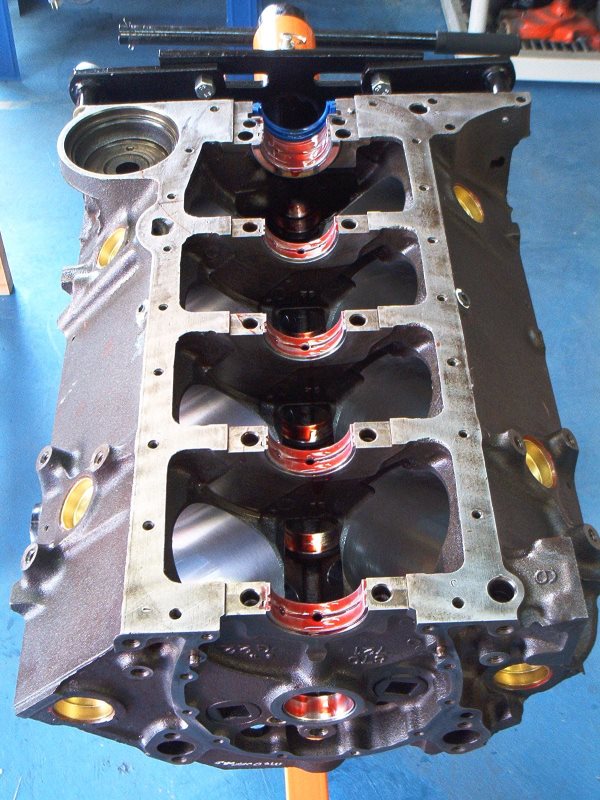 Freeze plugs (which have nothing to do with "freezing" - those holes are there to provide an exit path for the sand cores in the foundry "shake-out" line) and oil gallery plugs went in next, followed by the cam bearings, camshaft, then the main bearings and the crankshaft, followed by the rear main seal, main caps, timing chain and sprockets.