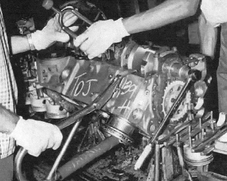 The operators then fired the engine, checked for oil pressure and oil or water leaks, set the timing, tightened the distributor hold-down clamp and chisel-staked the reference mark on the distributor base and intake, and listened for any unusual noises. Oil and water were drained, all test adapters were disconnected, and the engine was hoisted out of the test stand and placed on another conveyor that took it to the shipping area. Engines needing further attention due to test discrepancies were set aside for repairs; when repairs were completed, those engines were re-tested and sent on their way.