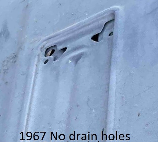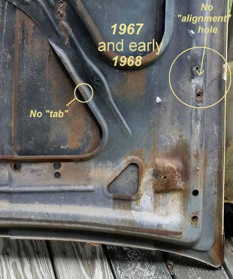 corners - 1967 and 1968 hoods don't have these tabs. In late May 1968, a hood hinge alignment hole