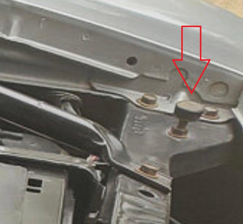 The front rubber hood bumpers (sometimes called hood stops) are located toward