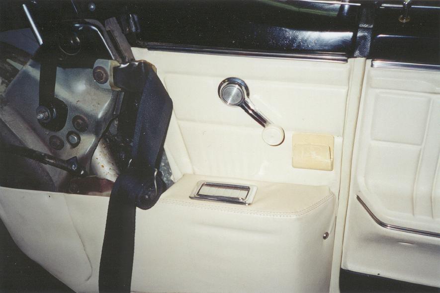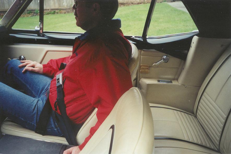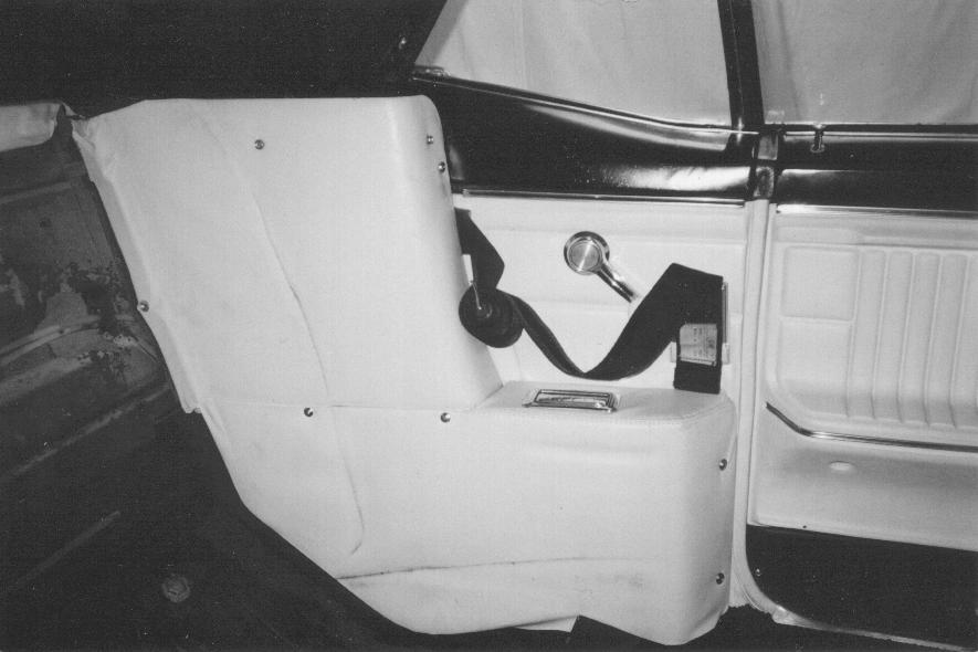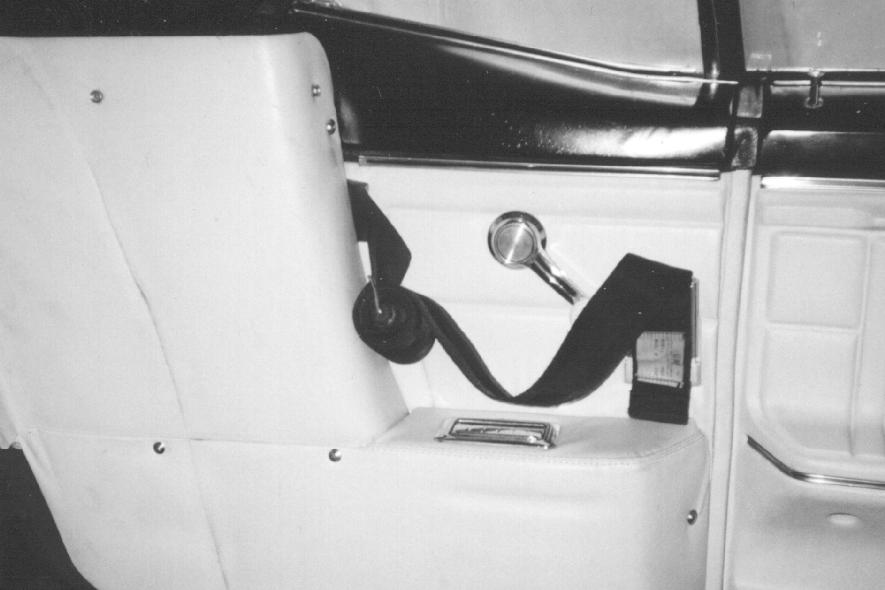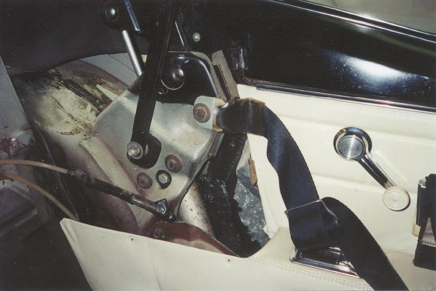 front seat and the drive shaft tunnel. However, the '67 shoulder harness set-up has