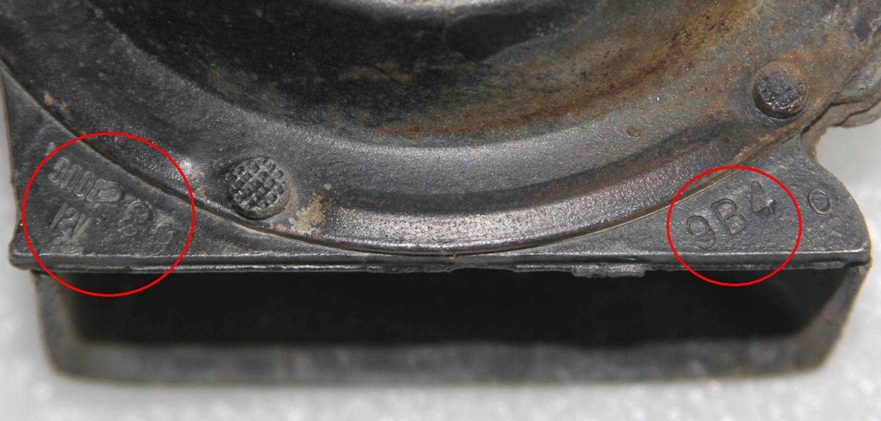 Horns may look similar, but are mostly unique to a vehicle application due to: the bracket (length and angle), the orientation of the bracket to the projector, and the orientation of the electrical connector to the projector. The bracket is staked to the horn so it is difficult to change the bracket or its orientation. Horns were mounted with the opening facing downward so water would drain out. The part number is on the bottom side of the horn flange - 9000 is molded into the horn and the last 3 digits of the part number are stamped next to it. The date is stamped on the opposing side of the horn flange. The date format is [year][month][week], where month is the letters A-M, e.g. 9B4 is 4th week of February, 1969.
