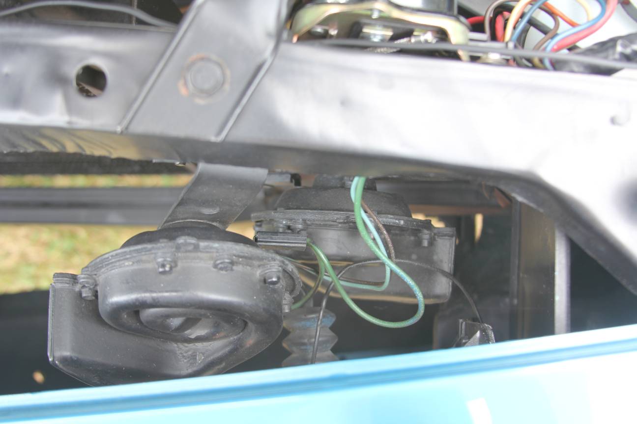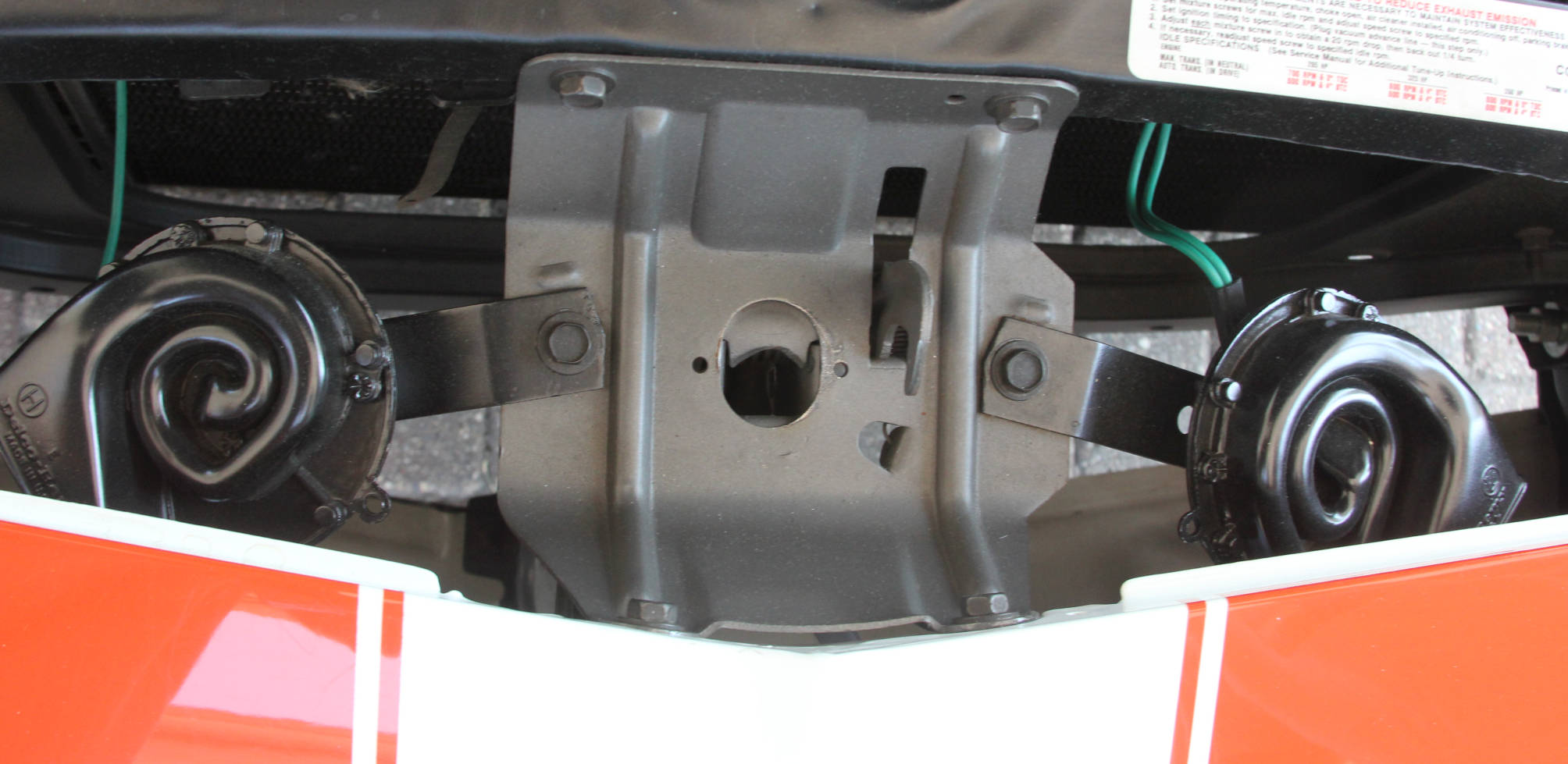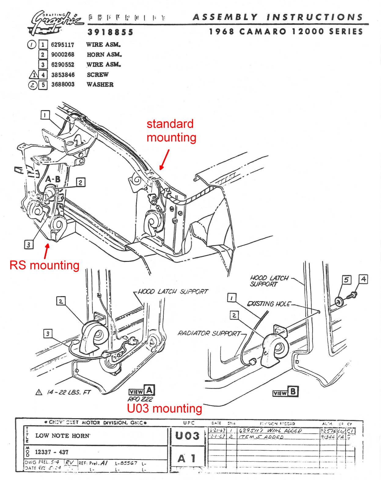 In 69, the two horns were mounted to the hood latch and RPO U03 was not available. Part # 9000289 was the low note horn and 9000290 was the high note horn. Both part numbers were also used on 1970 Camaros.